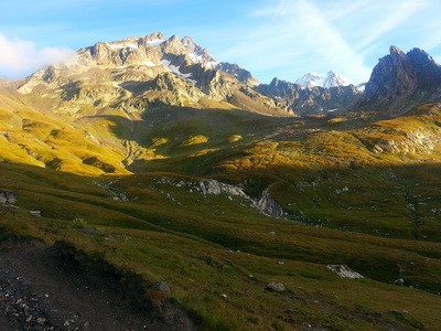 Komfortable 25 min vor dem Cut schlürfte ich die nächste Suppe, einen gefühlten Liter Cola und fräste mich durch 4 leckere französische Käsesorten (wirklich!), bevor der Berg wieder rief. 10,3 km, durchgehend aufsteigend, zum Col de la Seigne (2.502 m) sollten auch nur mit vollem Tank angegangen werden. Eine Schinderei war es dennoch, aber eine Schöne! Die aufgehende Sonne über dem Mont-Blanc-Massiv, das Lichterspiel am Mont Tondu, auf welchen ich vor einigen Jahren mit Junior Paul meinen Fuß setzte konnte, ließen die Qual vergessen. Es war eher zum Heulen schön!
