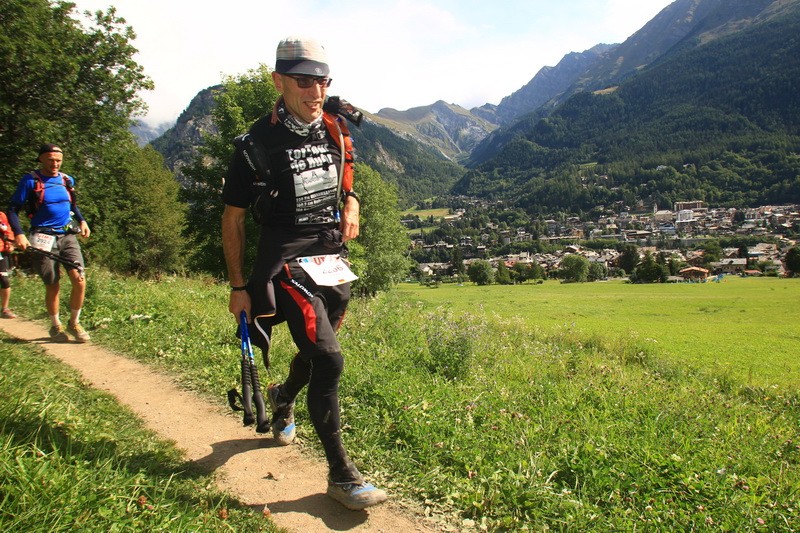 Der eiskalte Luftzug auf der Passhöhe trieb mich schnell wieder nach unten und schon bald, am Refugio Elisabetta, auf 2.300 m, war der nächsten VP am Lac Combal schon zu sehen. Erstmalig machte ich es mir hier auf einer Bank bequem, um ein leckeres warmes Süppchen zu schlürfen. 1:30 Std. vor dem Zeitlimit war das locker drin. Flink ging es trotzdem weiter, denn die Arrête du Mont Favre, der dritte Buckel um 2.500 m wollte bezwungen werden, bevor es mehr oder weniger talwärts nach Courmayeur ging. Am Col Checrouit noch eine Cola getankt und die Jacke ausgezogen, konnte ich die Bergsonne richtig genießen. In der großen Dropbag-Station im Sportzentrum von Cormayeur, am italienischen Ende des Mont-Blanc-Tunnels, begrüßte mich der gleiche Typ, der mich 2014 wegen einer geringen Zeitüberschreitung nicht hat weiterlaufen lassen. Diesmal hatte ich kein Problem mit ihm, da ich nun über 2 Stunden vor dem Limit lag. Die Menschenmassen, der Lärm und vor allem die Geruchswelt von Pasta über Kaffee bis zu Käsemauken, ließ mich hier nur kurz verweilen. Der Gedanke zu duschen, wurde schnell verworfen und ab ging es wieder in die Bergsonne, natürlich hinauf zum Refugio Bertone. 800 Höhenmeter am Stück schlauchten ganz schön, zu guter Letzt entschädigt aber ein herrlicher Blick ins Aostatal und noch ein leckeres Süppchen für die Mühe.