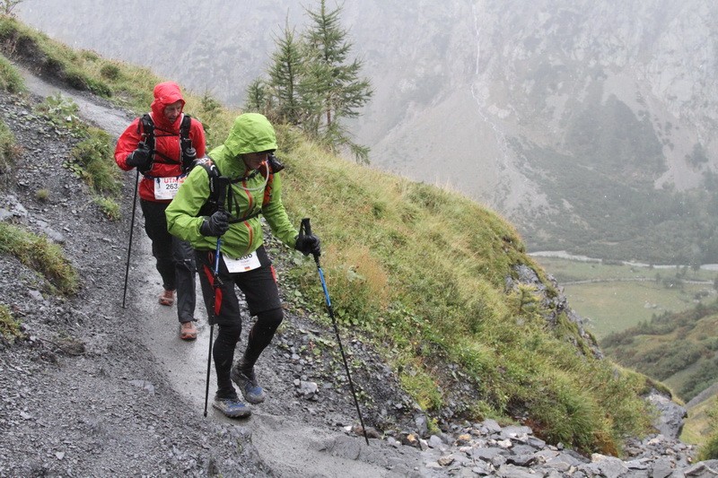 So schön es an der Hütte auch war, ich musste weiter. Ein paar Höhenmeter und an den Hängen des Val Ferret entlang hatte sich die Sache mit dem Sonnenschein schnell erledigt. Die kalte und steife Brise ließ mich ganz schnell ein Unterhemd und auch die Jacke wieder anziehen. Am Refugio Bonatti begann dann der Winter. Ein Buff als Ohrenwärmer unter der Mütze, dazu die Regenjacke und die Daunenhandschuhe noch an, machte ich mich auf den Weg ins Tal nach Arnouvaz. Oben biss sich der waagerecht daherkommende Schneeregen wie Nadelstiche ins Gesicht, weiter unten machte der Regen die Wege zu knöcheltiefen Schlammpisten. Mehrmals hatte ich Mühe die Schuhe nicht im Modder steckend zu verlieren. Es war mehr ein Kampf als ein Lauf in den VP zu kommen. Weiterlaufen von dort durften wir nur, wenn auch die Regenhosen angezogen waren. Vorteil, jetzt war der Rucksack fast leer. Wieder raus und hinauf zum Grand Col Ferret. Noch einmal auf 2.500 m. Der Weg war kaum begehbar. Daneben, über das Gras jonglierend, kämpfte ich mich hoch. Ich dachte, das Rennen wird abgebrochen, als ich an einer Alm mehrere Autos stehen sehe. Aber nein, so ein Wetterchen bringt die französischen Sportfreunde doch nicht aus der Ruhe! Je höher es ging, desto weißer wurde die Umgebung. Der Weg war nun wieder begehbar, weil die Pampe zusammen gefroren war. Dafür hatte ich zu tun, dass mich der Wind nicht umwarf. Nach gefühlten Ewigkeiten kam ich auf dem Pass an. Der arme Kerl der hier die Startnummern scannte tat mir echt leid. Ich wollte nur noch runter! Keine 200 Höhenmeter tiefer plötzlich ein Sonnenstrahl! Wie zum Spott! Es klarte auf und eine malerische Landschaft tat sich auf. Ja, die haben es halt drauf, die Eidgenossen.